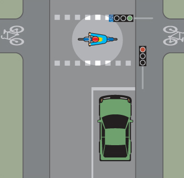 - När du har svängt i en korsning och ska passera en bevakad cykelöverfart ska du köra med låg hastighet och har väjningsplikt mot cyklister och mopedister (klass ll), som på rätt sätt har kört ut på eller just ska köra ut på cykelöverfarten.