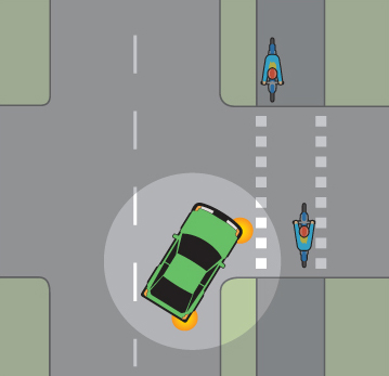 - När du har svängt i en korsning ska du köra med låg hastighet och du har väjningsplikt mot gående som på rätt sätt har gått ut på eller just ska gå ut på övergångsstället.